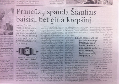 Photo : La traduction de l’article de Libération publiée dans l’édition du 3 septembre deSiauliu Krastas, le journal local. « La presse française trouve Siauliai horrible, mais apprécie le basket », dit le titre.