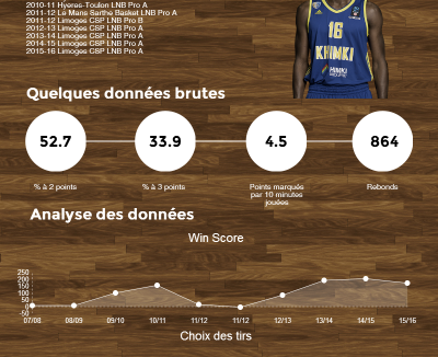 La saison 14/15 à Limoges est la meilleure saison de sa carrière professionnelle dans l’hexagone. J’ai trouvé un début d’explication dans sa prise de risques. En effet, comme le montre le graphique intitulé « choix des tirs », le joueur tente de plus en plus, ainsi la saison 13/14 connaît un pic de tirs tentés. On peut aussi remarquer qu’à partir de 2012, le joueur, qui tentait sa chance quasi-exclusivement à courte distance, tente de plus en plus sa chance à 3 points (de 16 à 79 tirs tentés!). Prise de risque payante puisque sa performance lors de la saison 14/15 est plus de 2 fois supérieure à celle de la saison 09/10 !