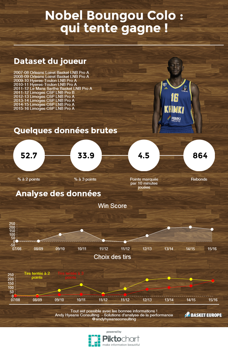 Comment résumer la première décennie professionnelle de Nobel Boungou-Colo, passé de la NM2 à la première division Russe en 10 ans ? C’est la question que nous nous sommes posés pour réaliser cette infographie réalisée par Andy Hyeans, consultant en ingénierie du sport et auteur de Sport Data Revolution.